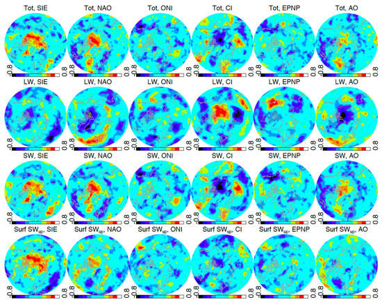 Correlation coefficient maps of CERES JJA TOA fluxes with the major indices (except snow cover) of interest.