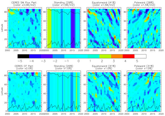 Figure 1 for the month of August, the TOA total flux has a strong latitudinal variation and gradient in the northern hemisphere (NH). By removing the time mean, a decreasing trend and large interannual variation emerge in the TOA total flux perturbations, which are dominated by the fluctuations in the TOA SW flux. The decreasing trend in the total flux at high latitudes implies that more energy had been absorbed by Earth in the past 20 years. The amplitude of interannual oscillations appears to be larger in the SW flux than in the total, suggesting that the LW component has compensated part of these fluctuations with the opposite sign.