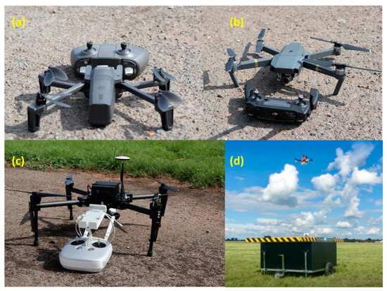 Unmanned aircraft systems compared for image quality acquisition at the Cranfield WWTP study site. (a) Parrot Anafi (Parrot, France); (b) DJI Mavic 2 Pro (DJI Technology Co, China); and (c) DJI Matrice 100 (DJI Technology Co, China). (d) Autonomous docking station (Herotech8, UK).