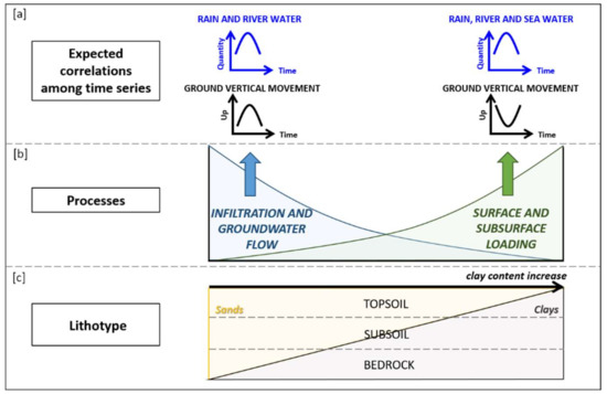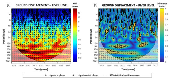 - Vitagliano, E.; Di Maio, R.; Scafetta, N.; Calcaterra, D.; Zanchettin, M. Wavelet analysis of remote sensing and discharge data for understanding vertical ground movements in sandy and clayey terrains of the Po Delta area (Northern Italy). J. Hydrol. 2017, 550, 386–398. [Google Scholar] [CrossRef]