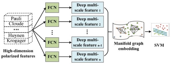 Aiming at these problems, this paper proposes a PolSAR image classification algorithm based on a multi-parallel FCN and a manifold graph embedding model. First, based on the scattering matrix and coherent matrix, high-dimensional polarized features of PolSAR data are extracted and color-coded according to different decomposition methods. Then, inspired by transfer learning, those synthesized multi-color maps are fed into the multiple-parallel FCN (MFCN) model, pre-trained on optical images, for deep multi-scale spatial feature learning. Feature maps from the last layer of the multi-parallel FCN-8s models are concatenated to generate better fused features. Finally, the manifold graph embedding model is applied to determine the effective representation of the fused feature in a low-dimensional subspace, which serves as the input of an SVM to obtain the final classification results. The main contributions of this paper are as follows: