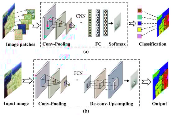 (a) CNN-based method for PolSAR image classification; and (b) FCN for PolSAR image classification.