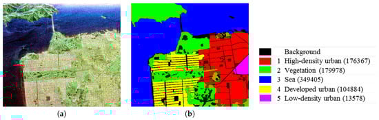 Figure 6. San Francisco dataset: (a) Pauli-decomposed pseudo-color image; and (b) ground-truth image and corresponding label. - (3)