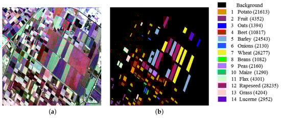 - and 1: These data were obtained in the Netherlands by the AIRSAR system of the NASA Jet Propulsion Laboratory in 1989. As a four-look fully polarized image of the L-band, its image size is pixels, and the resolution of the distance and azimuth are 6 and 12 m, respectively. According to Wang et al. [], the whole scene has been divided into 11 species: rapeseed, grass, forest, peas, lucerne, wheat, beets, bare soil, stem beans, water and potatoes. This fully PolSAR image, a classic farmland dataset, has been widely used to verify pixel-level classification performances. Its Pauli pseudo-color map, corresponding ground truth and labels are shown in Figure 5, and the pixel number of each class is given in the bracket of label image.