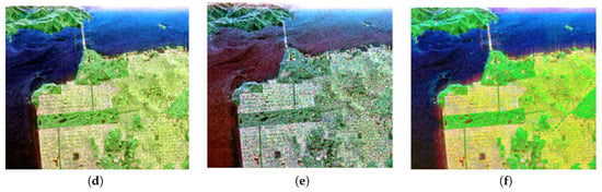 Images from some polarized decomposition methods: (a) Pauli decomposition; (b) Cloude decomposition; (c) Freeman decomposition; (d) H/A/ decomposition; (e) Huynen decomposition; and (f) Yamaguchi decomposition.