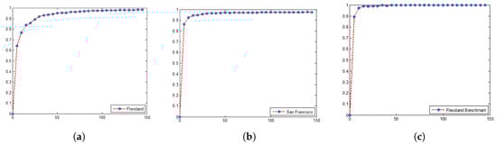 During the second stage, dimensionality reduction is conducted based on the manifold graph embedding model, and the training set and test set are divided. According to our previous research [], the training ratios for Flevoland Dataset 1, the San Francisco dataset and Flevoland Dataset 2 were set to 5%, 3% and 5%, respectively. In addition, when establishing the manifold graph embedding model, designing a weight matrix W and specifying a subspace dimension k also involve parameter selection. First, for a weight matrix W, a thermonuclear function (, Tikhonov regularization with a strength of 0.1) is chosen. In addition, the curve of the classification accuracy varies with the subspace dimensionality, as shown in Figure 9. Considering both the accuracy and time consumption, the subspace dimensions k of Flevoland Dataset 1, the San Francisco dataset and Flevoland Dataset 2 were set to 90, 50 and 35, respectively.