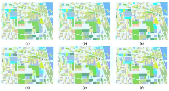 Classification results of the different algorithms in Flevoland Dataset 2: (a) LPP; (b) FCN; (c) FCN+LPP; (d) MFCN; (e) MFCN+LPP; and (f) GT.