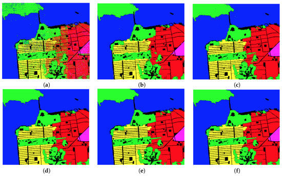 Classification results of the different algorithms in the San Francisco dataset: (a) LPP; (b) FCN; (c) FCN+LPP; (d) MFCN; (e) MFCN+LPP; and (f) GT.
