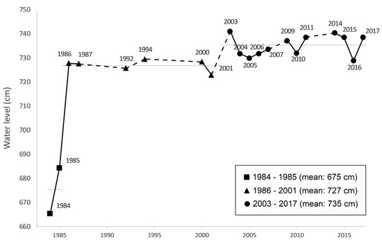 The study area for this research was Lake Tisza, the second largest lake in Hungary (Figure 1). This lake is artificial, established in 1973 to facilitate flood control. There is a dam at Kisköre that is responsible for managing the water level. The area of the lake is 127 km2 and includes several islands (43 km2) that fragment the water surface into partly separated water sub-basins. The largest component of this lake consists of flooded former ploughed lands and orchards, and several flooded oxbow lakes and deeper depressions are also present, which means that average water depth is just 1.3 m; the deepest point of the lake is 17 m within a former oxbow. The water level is artificially regulated, depending partly on the discharge of the Tisza River (the lake is a buffer for floods, and thus can mitigate the water level in the lower river section), and partly on the demand for irrigation and nature conservation. Increasing the water operation level by 150 cm was planned in three stages (1973, 1980, and 1995), but the third stage was cancelled due to concerns about the stability of affected dykes and consideration of the additional disadvantages (e.g., raised groundwater and diminishing valuable habitats). The raising of the water level is undertaken gradually during each year. Generally, the water level is 2 m lower in the winter season (when gates are opened at the dam), and filling begins in February and ends at the middle of April. During this period, flood management results in the lake reaching its operation level and, thereafter, the water level is kept more or less stagnant (725 cm at Kisköre). According to operational requirements, the water level has been changed three times over the course of the period examined in this study: between 1984 and 1985 (675 cm; began in 1980 and ended in 1985); between 1986 and 2001 (727 cm); and between 2002 and 2017 (735 cm) (Figure 2). KÖTIVIZIG (Water Directorate of Central Tisza Region) provided the water level data used in this research. The zero points of the water level reported herein were collected at ‘Kisköre felső’ at 81.32 meters above sea level. This is the southernmost point of Lake Tisza at the Kisköre Dam; the data presented here can therefore describe water level conditions across the whole lake.