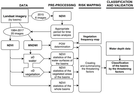 The workflow used in this study (NDVI, Normalized Difference Vegetation Index; MNDWI, Modified Normalized Difference Water Index; POW, Percentage of Open Water).