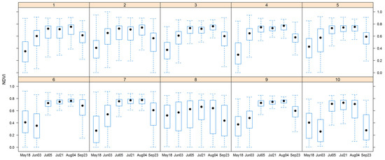 We discriminated three types of water basins within our study area on the basis of the observed NDVI dynamics, in high accordance with extent and depth. Large basins were characterized by open water surfaces, deep water, and minimal vegetation coverage. The smaller water basins comprised oxbows and paleo-channels with the deepest water. These smaller basins varied in indices and mostly had positive NDVI values with larger variance. Water caltrop requires a water level less than 2 m in depth, although other aquatic species such as duckweed were dominant in some years. In cases where water basins contained shallow water (less than 1.3 m), water caltrop occupied large areas. Excluding vegetated areas from NDVI statistics, we were able to delineate two water basin types based on quantitative differences. Water basins no. 1, 2, 4, and 5 mostly had NDVI values below zero, which means that they had more open water surface than the other basins (no. 3, 6–10). Observations of NDVI for the vegetated areas (Figure 7) resulted in just one class, which indicates that vegetated areas are homogenous.