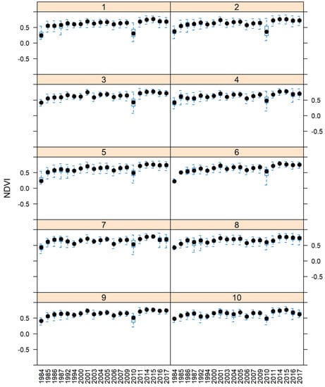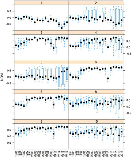 Next, we repeated our analyses for open water surfaces (MNDWI ≥ 0) as well as in areas of aquatic vegetation (MNDWI < 0). The results of this analysis enabled us to distinguish two trends in water surface NDVI values (Figure 6) with substantive differences between the two. The first type comprised water basins no. 1, 2, 4, and 5 and revealed a decreasing trend in NDVI values, as well as increasing values over the last three years between 2015 and 2017. In most years, however, NDVI values remained below zero and indicated open water. The second type (water basins no. 3, 6, 7, 8, 9, and 10) exhibited larger NDVI values and positive medians in most years. Water basins no. 3, 6, 7, and 8 all exhibited an increasing trend in the NDVI values between 1984 and 2000, while no. 9 and 10 were characterized by a stagnant but fluctuating trend.