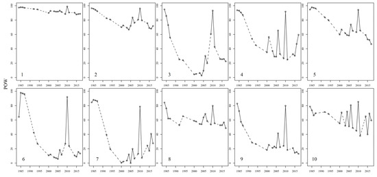 Water levels were 665 cm, and 685 cm in 1984 and 1985, respectively, while in consecutive years the level was operationally increased to around 725 cm. We therefore excluded 1984 and 1985 from the analysis in order to avoid generating false conclusions. Correlations between water level and POW fell between 0.00 and −0.53 even though these relationships were not significant (Figure 11) because of low sample size. We cannot consider these results to be representative of accurate outcomes: the low variance related to POW water level remains insignificant, while the relatively large correlations (between ca. 0.50 and 0.94) between water level values of studied water basins indicate that water level is very similar across the whole area within the reservoir. The only exceptions were water basins no. 8 and 10, both oxbow lakes, which are rather isolated in their situation and whose water budgets are independent of the regulated water table.
