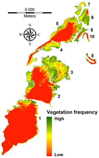 We restricted our analysis to the lake area regardless of aquatic vegetation cover, excluding terrestrial areas, and divided it into 10 water basins taking into account natural and artificial elements (Figure 1) using high resolution aerial images and topographic maps. The separation enabled us to reveal trends and the spatial distribution of changes in vegetation succession.