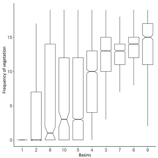 We then summed the vegetated areas over the course of this survey (Figure 9). Considering median vegetation frequencies, two clusters were recovered, namely, medians below 3, in the case of water basins no. 1, 2, 5, 8, and 10, with lesser risk of complete occupation by aquatic plants; and medians above 10, in water basins no. 3, 4, 6, 7, and 9. This latter group was at considerable risk (Figure 10).