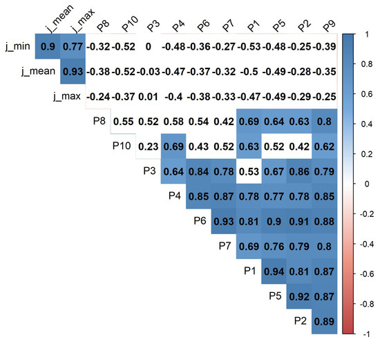 POW values were examined from the perspective of the relationship with the water level. Thus, July water levels (most of the satellite images were captured in this month) of each corresponding year were used in this analysis such that minimum (j_min), maximum (j_max), mean (j_mean), and standard deviation (j_sd) were calculated. Correlations were visualized using a correlation plot.