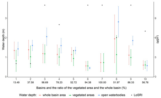 The LoSRI was developed in order to predict future changes including the spread of aquatic vegetation. The Spearman correlation was 0.60 (p < 0.05) between the LoSRI and average water depth taking into account all samples. Average water depth in the largest water basins (no. 1 and 2) was less than 1.4 m while open waterbodies were 1.42 m and 1.60 m in depth (Figure 12). These water basins also had small (13.49% and 37.58%) ROVWs and the smallest LoSRI values (i.e., equal to 2). Former river meanders (no. 3, 8, and 9) had the highest average water depths of open waterbodies (>1.85 m) and, because of their small POW and high ROVW values (greater than 51.97%), these are threatened by succession, particularly water basins no. 3 and 9 (ROVW values greater than 86.33%). The LoSRI values in this case were also high (i.e., equal to 11); water basins no. 6, 7, and 10 had shallow average water depths between 0.55 and 0.72 m, while water basins no. 6 and 7 had ROVW values above 94%. These water basins also had very high LoSRI values (i.e., equal to 11); water basin no. 7 was completely covered by vegetation while no. 6 had a minimal permanent open water surface area and a low (0.44 m) water depth. Although water basin no. 10 was a former meander, its average depth was only 0.59 m. This water basin also had a 56.76% ROVW value and a LoSRI equal to just 7.