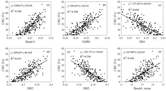 Regression relationships between CRC and the best predictors in each category ((a): Band 4, (b): NDRI, (c): 3BI1, (d): 3BI2, (e): 3BI3, (f): Band4_mean) (Table 3).