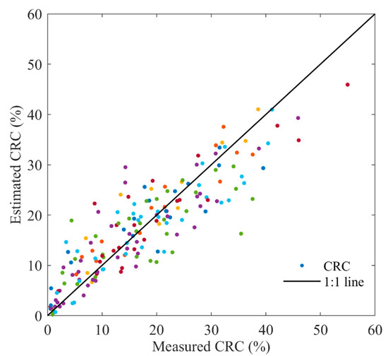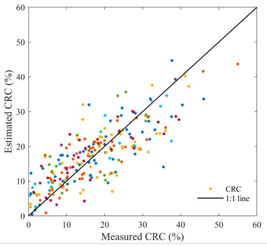 Table 4 presents a comparative analysis of the performance level of PLSR models based on the four groups of input variables. The PLSR model based on the nine MSI bands generated better results than any univariate models based on the MSI bands in terms of R2cv and RMSEcv. Similarly, the PLSR model based on the 13 CRIs yielded a higher accuracy of estimating CRC compared to NDRI and NDTI. In addition, the PLSR combining nine bands and four textural features contributed to a lower RMSEcv compared to that based on nine bands. The retrieval accuracy of PLSR was further improved by using 13 CRIs and four textural features as input features (R2cv = 0.66, RMSEcv = 6.427%). The addition of textural features enriched the effective information for CRC estimation. The scatter plot of measured CRC values versus estimated value by the best PLSR model is shown in Figure 6. It is noted that samples with CRC measurements below a value of 20% were systematically overestimated and those higher than 20% were underestimated.