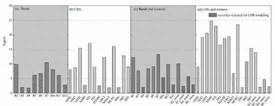 The logarithmic sigmas of GPR models with different groups of input predictors ((a): MSI bands, (b): CRIs, (c): Bands and textures, (d): CRIs and textures).
