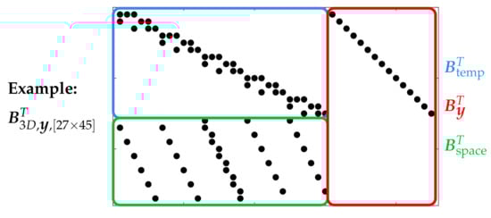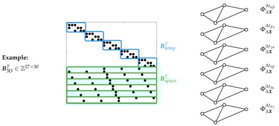 The dimension of the constraint matrix quickly becomes large for an entire D-InSAR stack. However, one row of the matrix has only three entries which are non-zero. Therefore, it is a sparse matrix. Figure 3 shows a small D-InSAR stack consisting of interferograms shown in the right subfigure. Each interferogram consists of spatial phase gradients, see black lines between the white points which represent the stable pixels. In time, there exist temporal constraints between the spatial phase gradients. In the left subfigure, the structure of the global constraint matrix is shown. The three temporal constraints fill three rows in the global constraint matrix, see one blue framed block, with three non-zero entries per each row symbolized as black dots. As there are spatial gradients in total, there are five times the blue framed block. The green bordered blocks symbolize the spatial constraints. In each interferogram spatial constraints can be set up. Since there are interferograms in total, six of these green blocks exist. The dimension of the constraint matrix is therefore .
