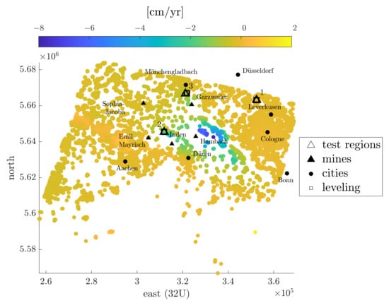 - Esch, C.; Köhler, J.; Gutjahr, K.; Schuh, W.D. 25 Jahre Bodenbewegungen in der Niederrheinischen Bucht—Ein kombinierter Ansatz aus D-InSAR und amtlichen Leitnivellements. Z. Geod. Geoinf. Landmanag. 2019, 3, 173–186. [Google Scholar]