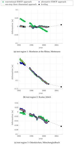 For a further investigation, the time series of five pixels located in the three test regions highlighted in Figure 6 are analyzed and compared with the closest leveling point. Therefore, the leveling data measured by GeoBasis NRW in a four-year cycle from 1993 to 2001 are used. The campaigns are individually evaluated in an adjustment following [] with a total of four reference points located in Viersen, Cologne, Aachen, and Rheinbach. When comparing interferometric and leveling data, the problem of different spatial and temporal resolution and the problem of different reference points occur. For the analyzed pixels, the nearest leveling data are within a radius of 300 m or less. It can therefore be assumed that both data sets observe a similar deformation, since no abrupt changes are assumed. In general, the D-InSAR data measure movements in line-of-sight and the leveling data relate to vertical height changes. However, since only ERS data from descending orbits are available in this study, it must be assumed that no horizontal movements take place. The time offset is compensated by transferring the interferometric data to the leveling data with help of a local offset, cf. []. Figure 8a–c show the corresponding deformation time series after applying the local offset. The reader is reminded that the vertical axes of the plots were chosen differently, since the analyzed pixels show differently strong motions. The green triangles are the results using the conventional EMCF method, the dark blue points are the results using the alternative EMCF method and the results of the one-step three-dimensional approach are shown as orange points. In addition, the closest leveling point is shown as black squares.