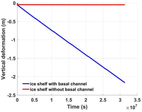 Through the continuous tracking displacement of one point on the ice shelf surface (black arrow in Figure 3), it was found that an ice shelf underlain by a basal channel exhibited a strong rate of subsidence. For an ice shelf without a basal channel, the surface depression where the surface of the ice shelf changes most with time is significantly less than that under the former condition as shown in Figure 4. This also confirms the results obtained by previous studies [17,25].