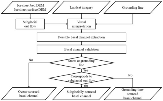 Basal channels are identified as surface depressions visible in satellite imagery due to the correlation between the surface depression and the basal channel [25]. Alley et al. (2016) developed three channel categories based on whether the channels intersect the grounding line and whether they are coincident with the simulated location of subglacial outflow. Based on the above standards, basal channels can be divided into subglacially-sourced channels, grounding-line-sourced channels and ocean-sourced channels. The formation of a subglacially-sourced channel occurs when the fresh water released by the subglacial drainage outlets is less salty than the surrounding sea water. The fresh water continues to cut through the bottom of the ice shelf as it rises in a plume along the subglacial surface, creating a basal channel based on the drainage of the subglacial river. The prerequisite for the formation of a grounding-line-sourced channel is that the warmer seawater at the bottom generates enough melt water near the grounding line. Similar to the formation process of the subglacially-sourced channel, the freshwater density generated by melting under the action of the warm seawater at the bottom of the ice shelf is lower than that of the surrounding seawater. Under the action of buoyancy, it will rise along the surface of the ice shelf and continuously cut the ice shelf to form a channel at the base of the ice shelf. The ocean-sourced channel is formed by the same principle as the grounding-line-sourced channel. When the warm water layer at the bottom is thick, the starting position of the channel is far from the ground line. The specific processes of the extraction of different types of basal channels are shown in Figure 5.