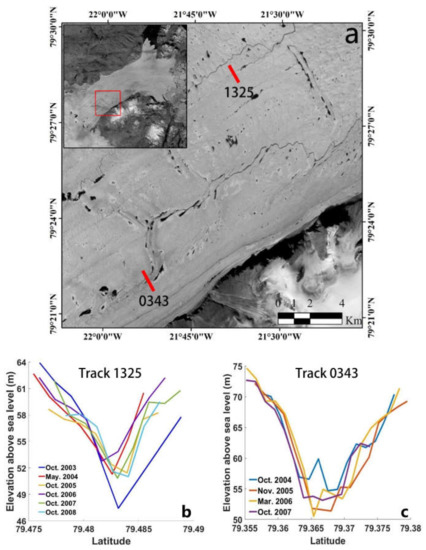 Figure 6. An example of a depression on the 79NG ice shelf verified by ICESat. (a) Depression distribution on the surface of 79NG ice shelf. The solid red line indicates ICESat satellite orbit. (b) and (c) represent the ICESat data track 1325 and track 0343 respectively.