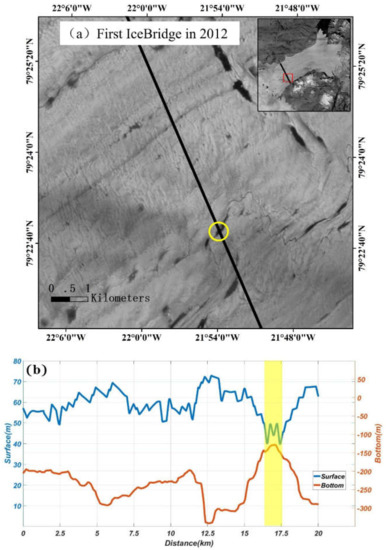 Figure A2. The third IceBridge in 2012 validates the data and Landsat imagery. (a) shows the surface morphology at the third IceBridge data in 2012, with IceBridge airborne radar flight path (black solid line). The location indicated by the yellow circle is the area confirming the existence of the basal channel. (b) shows the results from the third IceBridge in 2012. The yellow area corresponds to the yellow circle in (a).