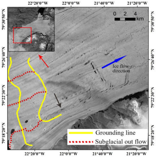 The location of the grounding zone marks the area where the ocean terminal glacier begins to float. The detection of the grounding line presently consists of field detection and remote-sensing extraction. Considering the elastic fluid characteristics of the ice shelf, a grounding zone is formed under the action of ocean tides. This means that the area between two grounding lines is the grounding zone. To more accurately distinguish the type of basal channel, this paper used the grounding line provided by the Climate Change Initiative (CCI) as the judgment basis [24]. The dataset includes five outflow glaciers in northern Greenland.