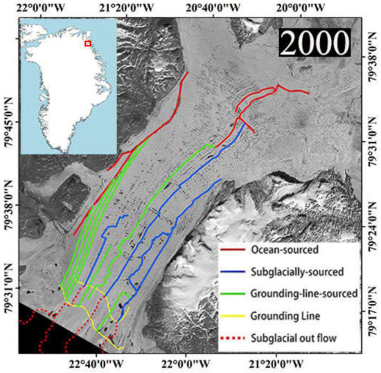 The spatiotemporal variation sequence of the basal channel was extracted from the annual Landsat 7/8 image data of the 79NG ice shelf in Northeast Greenland from 2000 to 2018. Figure 10 shows the total basal channel distribution in 2000. The complete basal channel distribution results were shown in Appendix A (Figure A5).