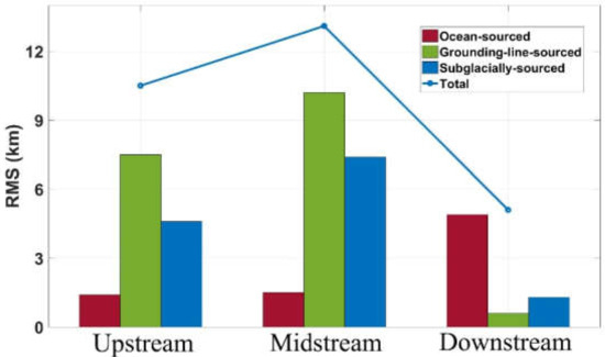 The area where the length of ocean-sourced basal channel changes mainly focuses on the downstream of the ice shelf as shown in Figure 11. This is due to its spatial distribution, as they are mainly concentrated in the calving front of the ice shelf. The length of grounding-line-sourced basal channel changed mostly in the upstream and midstream. This is because the grounding-line-sourced basal channel starts from the ice shelf grounding line. Most are short in length and end upstream or midstream, so the changes are concentrated at this location. The RMS of the subglacially-sourced channel length is 7.4 km in the midstream, which is higher than the other two areas. This is for the subglacially-sourced channel that has continuous and stable outlet drainage support under the ice sheet, making it longer than the grounding-line-sourced channel. Under the condition that the initial position remains unchanged, changes of the subglacially-sourced basal channel length can only occur in the midstream of the ice shelf.