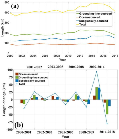 According to the time scale analyzed (Figure 12), the length of the basal channel did not appear monotonously elongated or shortened for consecutive years before 2009. After 2009, except for a slight decline in 2013, the total length of the different types of basal channels reached the maximum value within the statistical range in 2014. The grounding-line-sourced basal channel changed the most in the primary stage of development of the basal channel from 2009 to 2014 and the stage of shortening from 2014 to 2018. Combining the above content, it is not difficult that the change in the length of the basal channel is mainly concentrated in the midstream of the ice shelf, especially during 2009–2014.