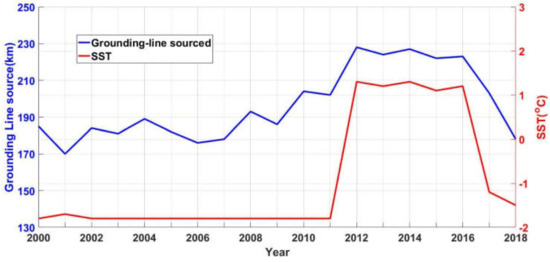 The SST and shelf calving front were used to analyze the changes of the ocean-sourced basal channel. The two influencing factors were provided by Met Office Hadley Center (MOHC) and Climate Change Initiative (CCI) separately [58,59]. However, the dataset of the ice shelf calving front provided by CCI contains only contains the descriptions of the 79NG for two relevant years (2008 and 2015). To further investigate the correlation between the basal channel and calving front from 2000 to 2018, we extracted it manually from Landsat 7/8 images and combine it with available two-year data provided by CCI. The reason for choosing these influencing factors is mainly based on two strategies when extracting ocean-sourced basal channels: (1) away from the grounding line and (2) downstream of the ice shelf. Based on the above criteria, the SST and calving front were used in the basal channel analysis in this region.