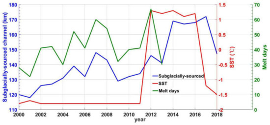 Figure 16 shows the time series of the subglacially-sourced basal channel length, melting days of the ice sheet surface and SST. During the period of no significant change in the SST from 2000 to 2011, the length of the subglacially-sourced channel was mainly affected by the surface melting days. The correlation coefficient between the subglacially-sourced basal channel and melting days is 0.76 from 2000 to 2013. The melting days of the ice sheet reached maximums in 2003, 2005 and 2007, and the length of the subglacially-sourced basal channel also reached a peak during the same periods. Between 2007 and 2009, as the melting days decreased, the length of the basal channel decreased from a maximum of 148 km to 129 km, and the cumulative change was 19 km. After 2012, the SST rose abnormally at first and then fell below zero in 2017, and the length of the subglacially-sourced basal channel changed accordingly. Through a statistical analysis of the limited data, the conclusion is drawn as follows. From 2000 to 2011, the subglacially-sourced basal channel was mainly affected by the melting days. After 2012, the subglacially-sourced basal channel was mainly affected by the SST. From 2012 to 2013, this type of basal channel was affected by the melting days and SST combined. However, due to the lack of melting days after 2013, it is impossible to further analyze the corresponding influencing mechanism on the basal channel length change.