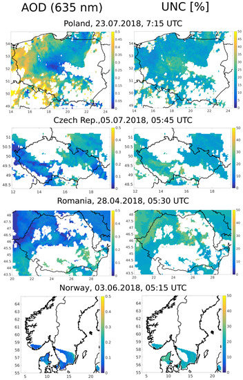 After analyzing the retrieval output obtained during the preoperational test-phase, several fine-tuning adjustments were necessary to be added to the code. In the case of the uncertainty calculation, the value of the share of other sources share was increased to 15% for the Czech Republic (low number of ground-based AOD stations) and for Norway (geographic position, complicated shore-line). For the area of Romania, an additional factor was considered, which is the elevation above sea level (a.s.l.), i.e., for all pixels that cover the area located > 1 km a.s.l., the total uncertainty was increased by 10%. These adjustments were included in NRT calculations performed from April 2019 for all domains, whereby from then onwards, the maps are stored at the PolandAOD-NET Server and the High-Performance Computing Server of the Babeș-Bolyai University.