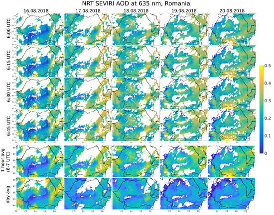 SEVIRI AOD at 635 nm in the country domain for Romania. Data were obtained from NRT calculations. In four upper rows, 15 min AOD maps are presented for days 16–20 August 2018. The last two rows contain hourly averages (6:00–6:45 UTC) and daily averages (all possible files for each day).