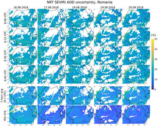 The largest number of days with available NRT AOD was registered in August 2018 for Romania (i.e., 9, 10, 12–20, 24–26, 29–31 Aug 2018). In Figure 3, several of these days are shown as an example in columns. The first four upper rows contain consecutive maps of AOD obtained with a time resolution of 15 minutes. The shown data cover the hours between 6:00 and 6:45 UTC. The remaining two rows show AOD maps for, respectively, hourly average (6:00–6:45 UTC) and a daily average of AOD data. In the latter case, all possible files for each day were taken into account. For most of the days (17–20 Aug), is clear that the hourly mean of AOD were similar to the 15 min data, while by averaging daily data detailed information was lost. In the case of 16 Aug 2018, small differences in the hourly versus daily mean indicate stable conditions of the atmosphere. Similar relationships can be observed in the AOD uncertainty (Figure 4).
