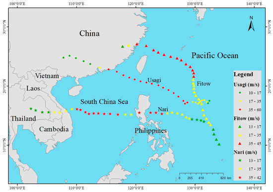 In this study, we selected the Northwestern Pacific and coastal areas as a study area (Figure 1). There are, on average, 26–28 tropical storms and typhoons each year, two or three of which can reach typhoon intensity. Typhoons here are seasonal and usually occur from July to September [14]. We chose three representative typhoons (Usagi, Fitow, and Nari) that occurred in 2013 to validate the effectiveness of the proposed model. Detailed information about the TCs is described as follows.