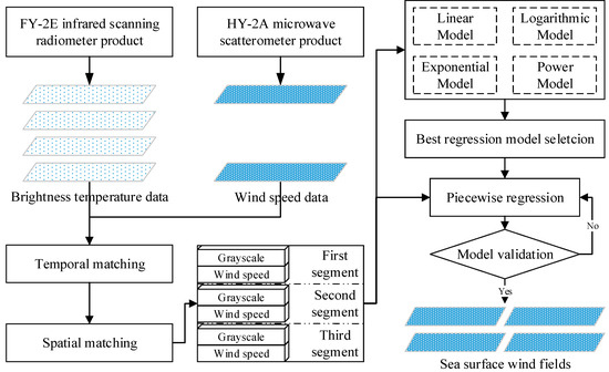 The process detailed in Figure 2 includes the following steps: (1) wind speed data extraction from HY-2A; (2) brightness temperature data extraction from FY-2E; (3) temporal and spatial matching of wind speed and brightness temperature; (4) sea surface wind speed inversion model development; and (5) model validation.