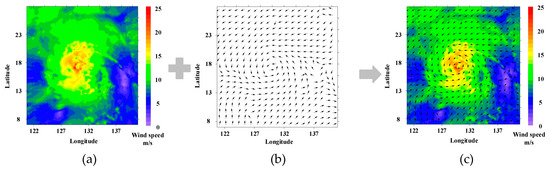 Schematic diagram of the wind field process: (a) wind speed map; (b) wind direction map; (c) wind field map.