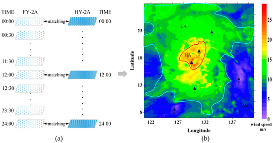 As weather conditions differ over time, before spatial matching, temporal matching is first needed to ensure that the acquire time of the HY-2A data is close to that of the FY-2E data. Because the temporal resolution of the FY-2E data (0.5 h) is higher than that of the HY-2A data (12 h), we used the HY-2A data as the basis to match the corresponding FY-2E data. The schematic diagram of the temporal matching process is shown in Figure 4a.