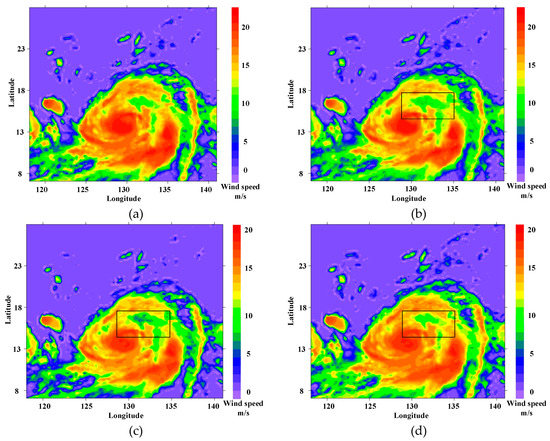 The sea surface wind field (SSWF) inversion maps by four regression models; the rectangular box represents the place where the inversion accuracy is low: (a) the linear model; (b) the exponential model; (c) the logarithmic model; (d) the power model.