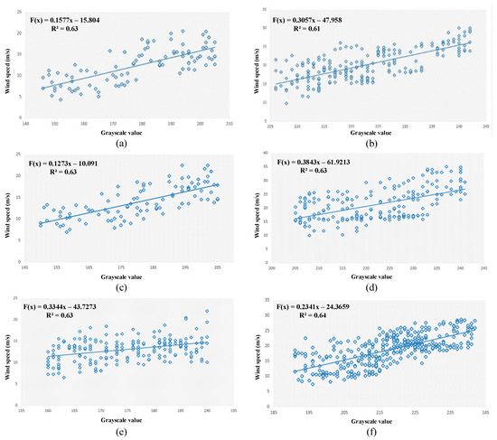 Best regression model selection: In this study, we built four commonly used regression models to predict wind speed, including a linear model, an exponential model, a logarithmic model, and a power model. F(x) represents wind speed, and x represents brightness temperature (grayscale value). We then used the determination coefficient (R2) to select the best regression model. The higher the R2, the better the fit.