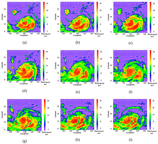 The sea surface wind field of Usagi at different times: (a) 1:00; (b) 3:00; (c) 5:00; (d) 7:00; (e) 11:00; (f) 13:00; (g) 15:00; (h) 17:00; (i) 20:00.