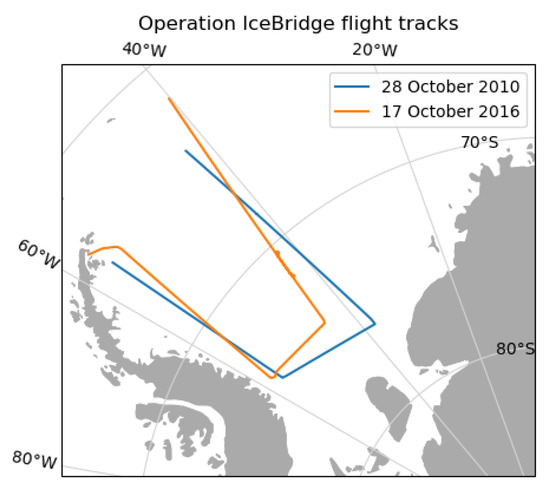 The main source of data for this work are the Airborne Topographic Mapper (ATM) L1B elevation datasets and the Snow Radar L1B radar echo strength profiles, both available from the National Snow and Ice Data Center (www.nsidc.org). The snow depths are computed from the radar echograms following Kwok and Maksym [9]. We focus specifically on Weddell Sea flights from 28 October 2010 and 17 October 2016 (Figure 1).