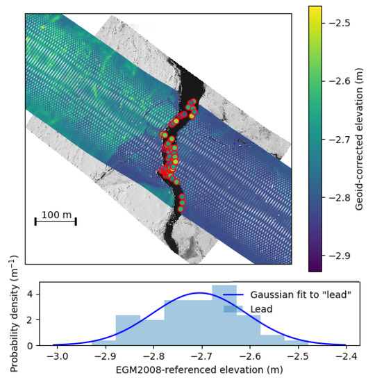 An example of the lead-finding algorithm. The DMS camera imagery is shown with the lidar points overlain. The lidar swath is approximately 250 m across-track. The lidar points that are within the lead are circled in red, and their distribution shown in the bottom panel. The elevations have been geoid-corrected from the OIB L1B-ATM data. Note the distribution of lead elevations is approximately Gaussian (best Gaussian fit shown in blue).