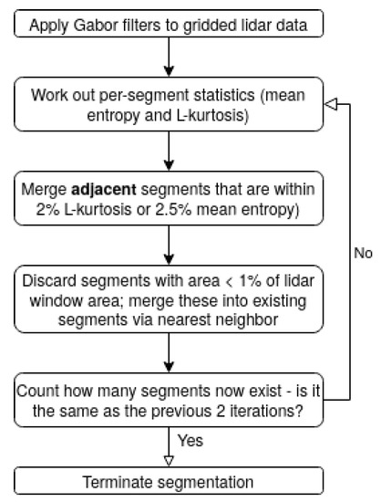 We convolve a set of 20 Gabor filters with each window in order to distinguish different textural areas. The filters are oriented at 45, 90, 135 and 180 degrees, corresponding to wavelengths 2.8–45 m, with Gaussian kernels of size 11, standard deviation 7, zero phase offset and uniform spatial aspect. These hyperparameters were selected by manual experimentation. The filtered images are then passed through a nonlinear transducer (essentially a sigmoidal activation function using hyperbolic tangent) to accentuate high-activation areas, following Jain and Farrokhnia [55], and Gaussian-smoothed (kernel size 15). Filtered images with a low variance (below 0.0001) are discarded. The resulting feature vector consists of the filtered images and x and y coordinates of each pixel. Similar textures should have similar activations, and so the feature vector can be clustered using k-means clustering with a fixed number of clusters (here, we use 6, again manually chosen). We then look for contiguous segments (some of which may have the same cluster label) by using a standard open-source contour-finding method from Suzuki and Abe [56] implemented in OpenCV. Then, for each contour (segment), the neighboring segments are found, and their mean entropy and L-kurtosis are computed. These metrics were chosen by manually classifying 2000 images and using a decision tree to identify the most relevant metrics for distinguishing snow features from deformed ice. If the mean entropies of a segment and its neighbor are within 2.5%, and/or if the L-kurtosis are within 2%, then they are merged. Then, all segments are assigned a unique label. Small windows (less than 1% of the lidar window size) are erased and their pixels are ‘absorbed’ by their nearest neighbors. This is repeated until there are no more segments that can be merged. This process is summarized in Figure 3 and illustrated in Figure 4. We can now identify the segments that have snow depth measurements.
